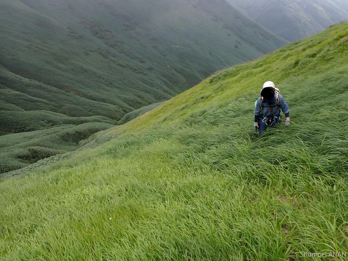 大きめ目のC滝が眼下に見えるが、わざわざ沢に降りて右岸を巻き直すのは面倒なので、そのまま踏み跡をつかって巻いていく。 すると見晴らしのいい草付きとなり、B滝前へは懸垂下降で簡単に降りれそうだ。