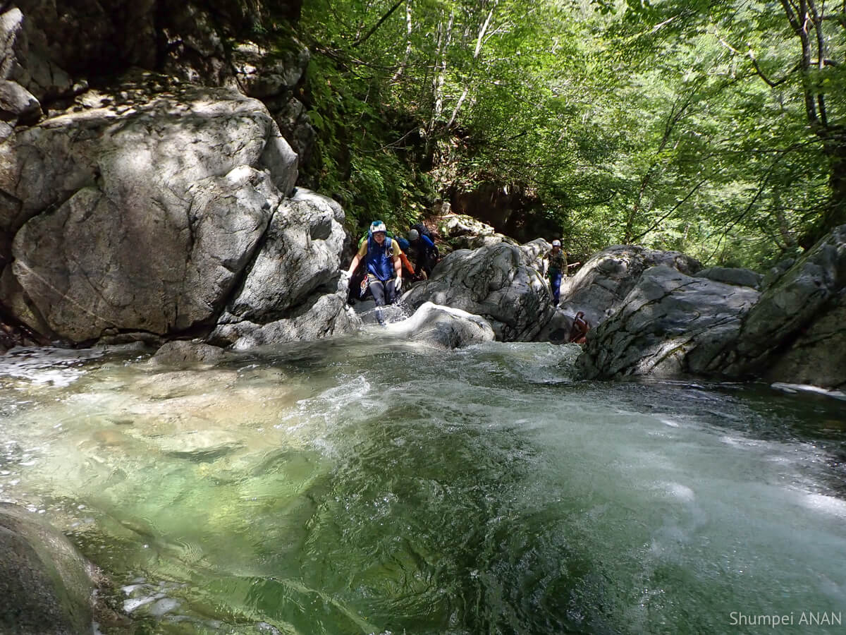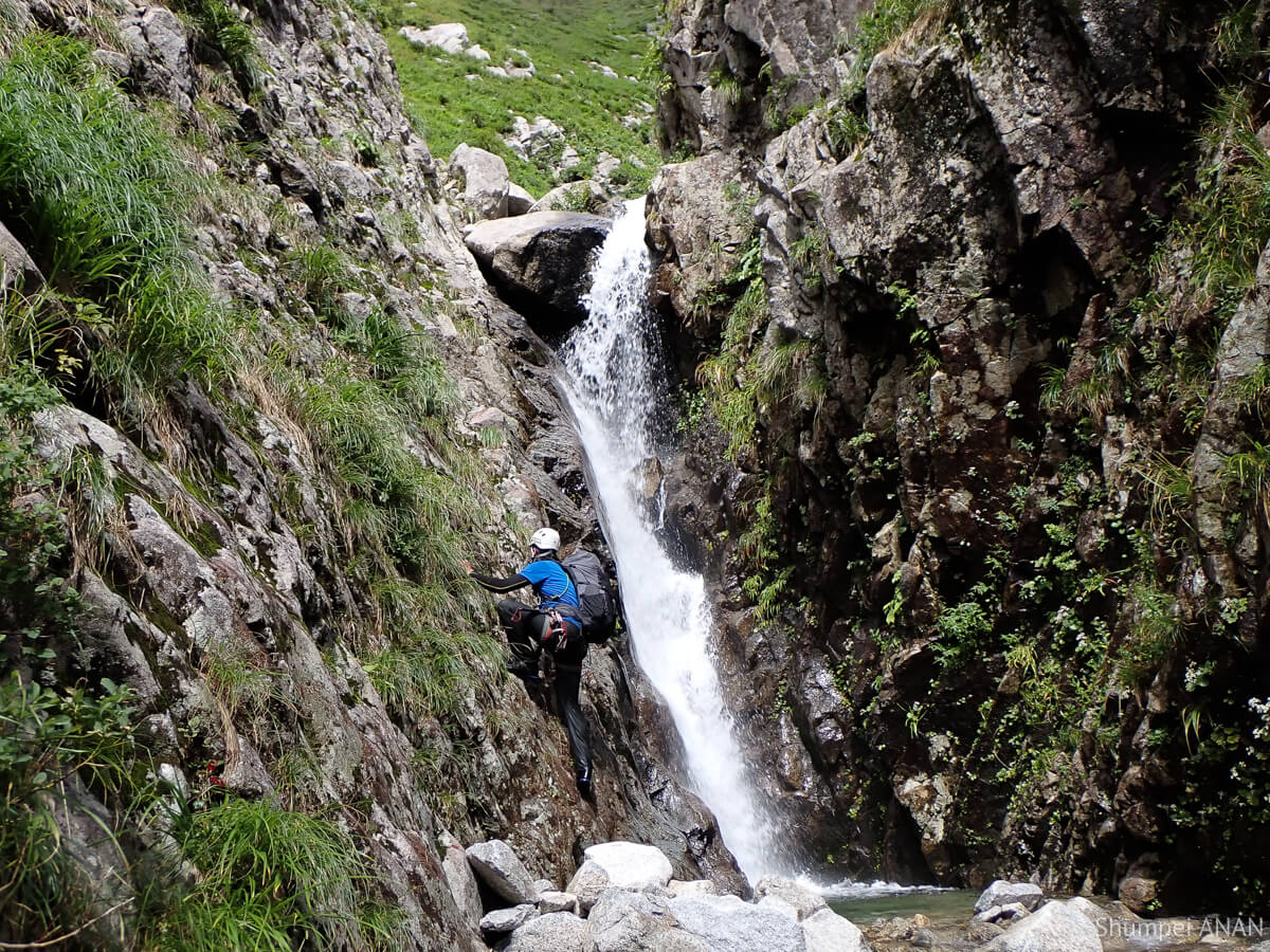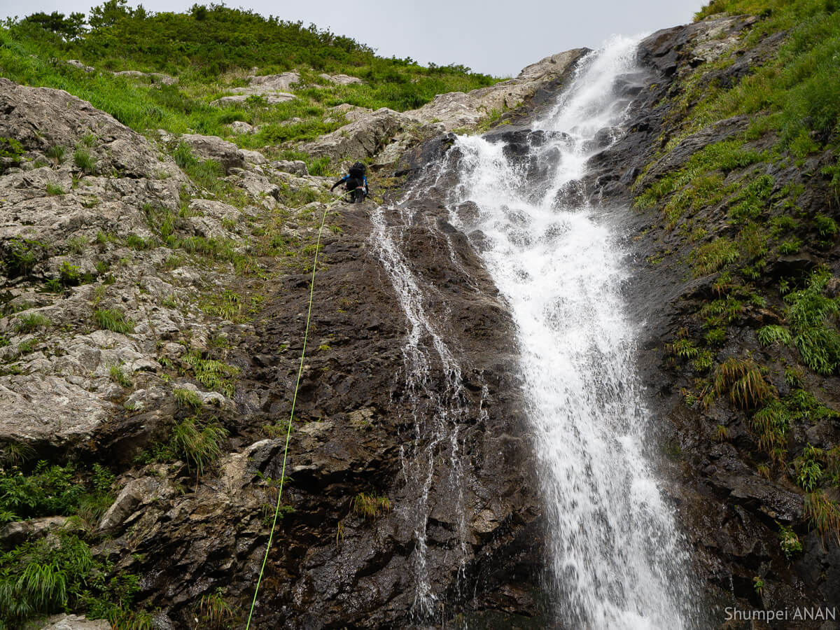 ひょんぐっている13m滝は右壁を爽快に登る。この辺りからますます沢は綺麗になる。