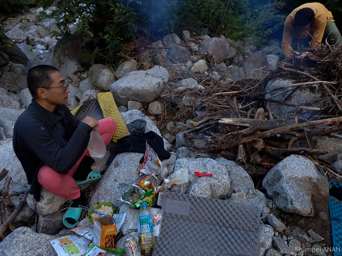 薪はたくさん集まって、各人が担いできた食材で大宴会がスタート。