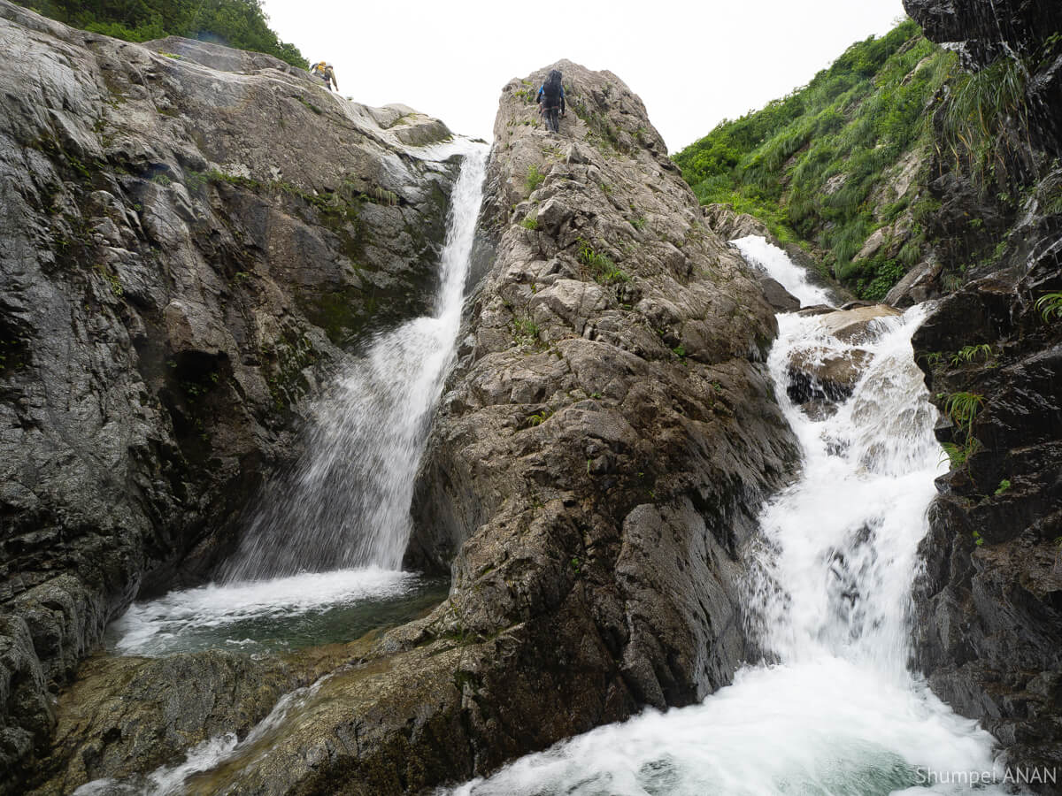 Co1150でようやく左岸から岩魚止沢が出合う。岩魚止沢はいきなり2段9m滝となっていてボロい左壁を登る。