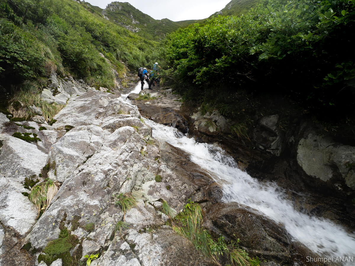 朝日鉱泉から朝日俣沢沿いの長い登山道を歩く。今朝までの大雨で沢は笹濁りの増水だ。