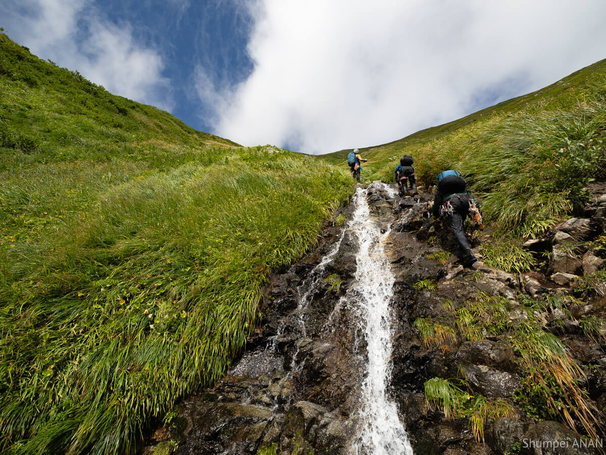 急な斜面を登り、最後は低いハイマツを数分漕ぐと登山道に出た。最後まで爽快な素晴らしい沢だった。