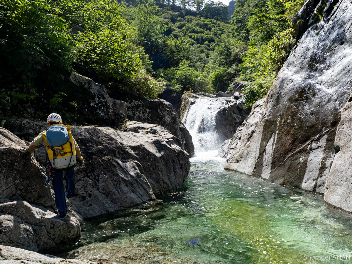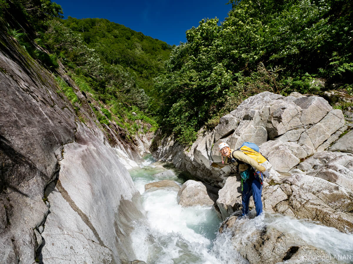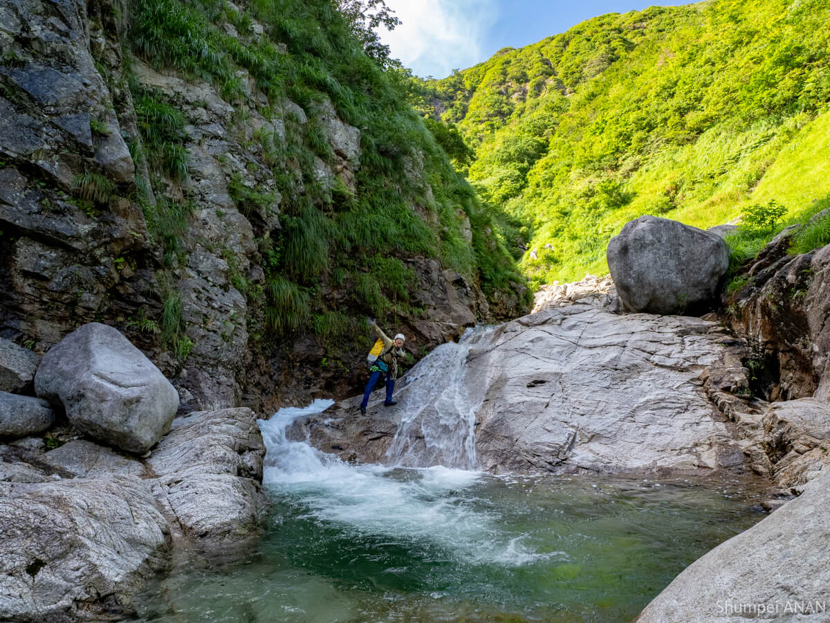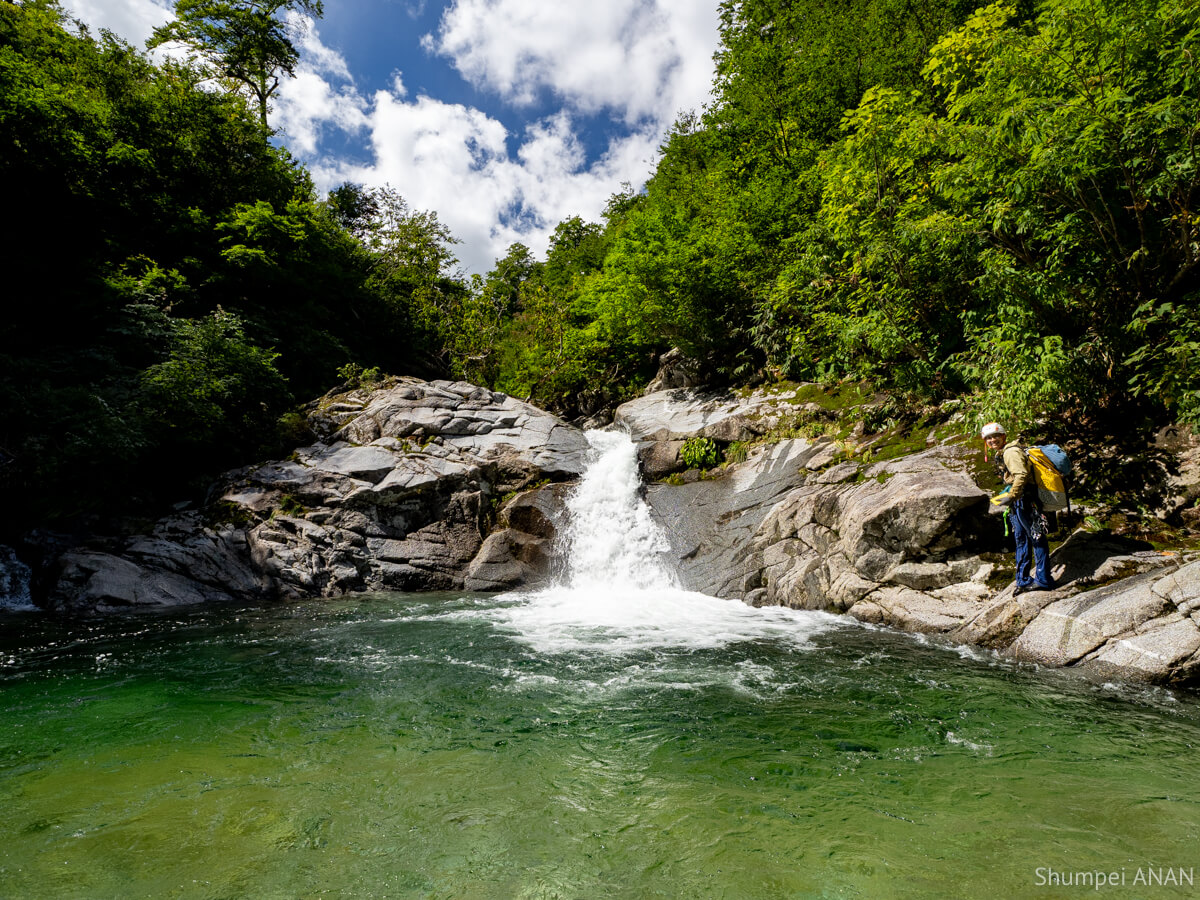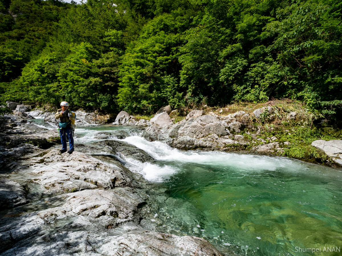 これより先は一層美しい。どこを切り取っても綺麗な沢だ 終始ハイライトとなる区間が続き、沢へ行ける機会が少ない中澤さんも大喜びしている。