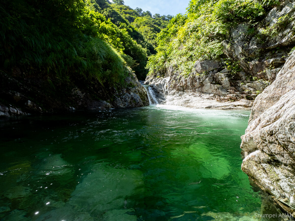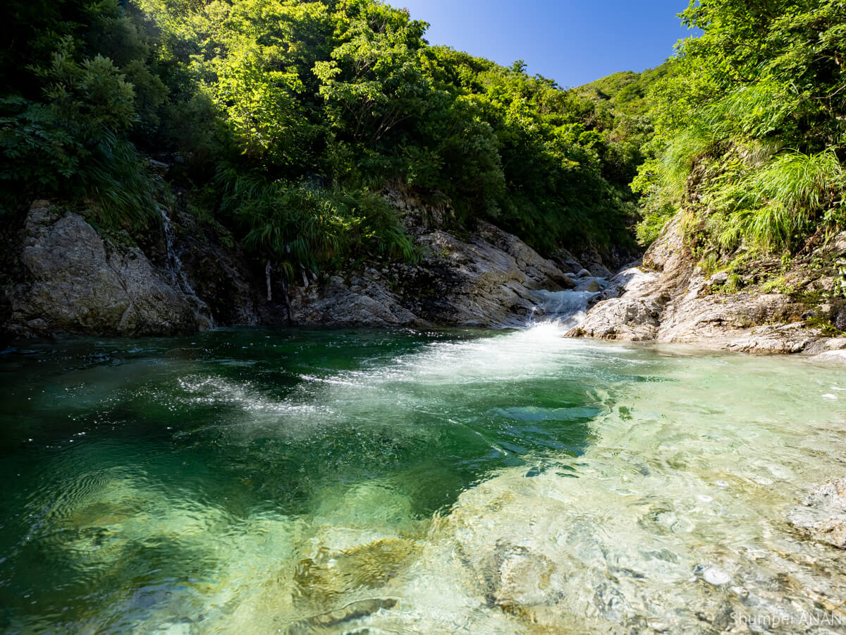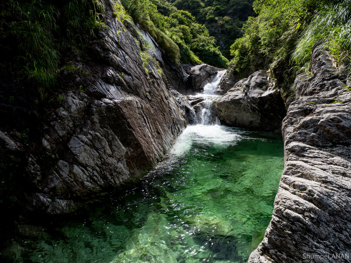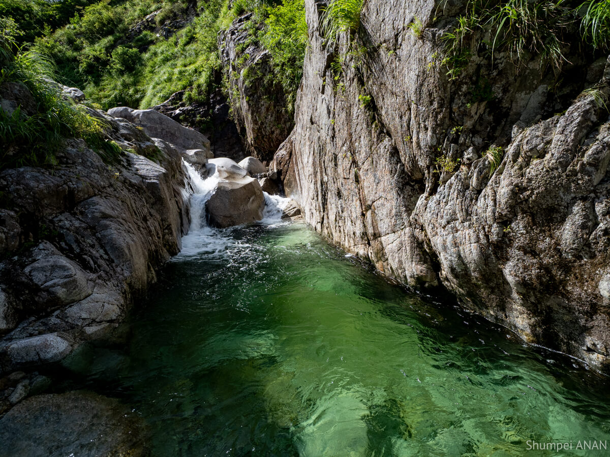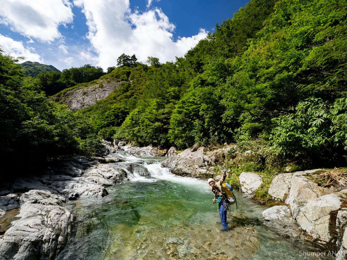 これより先は一層美しい。どこを切り取っても綺麗な沢だ 終始ハイライトとなる区間が続き、沢へ行ける機会が少ない中澤さんも大喜びしている。