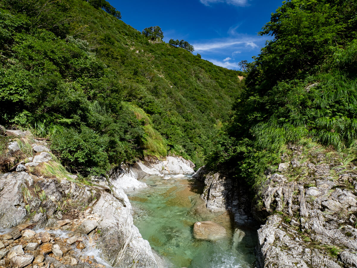 先日に記録的豪雨が降ったため、苔や泥などが磨かれたのだろう。沢床は驚くほど白くクリア。 水面から5m上くらいまで草木が薙ぎ倒されていて増水の凄まじさを物語っている。