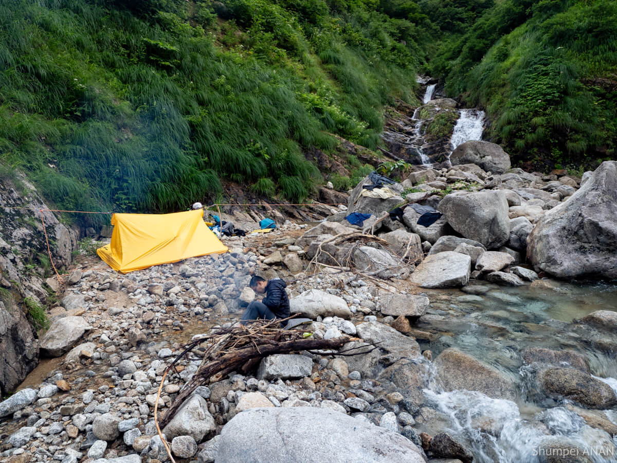 Co950、滝で出合う右岸支流のところがようやく河原になっていたため、整地してここに泊まることとした。