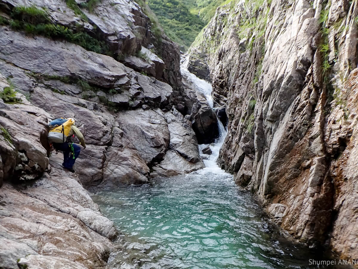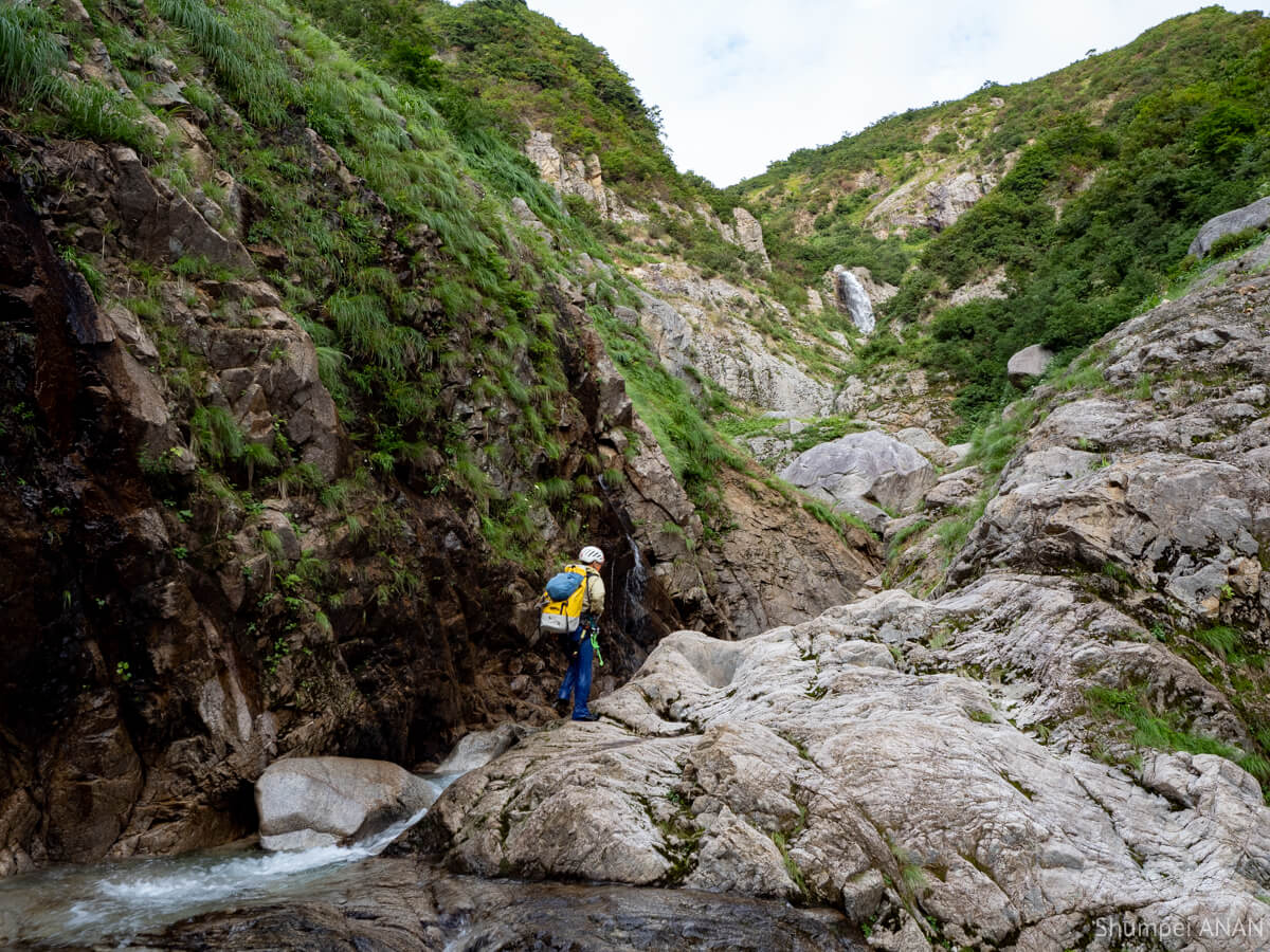 行動開始早速、昨日見た2段滝を登る。草付きから巻き気味に登るが、やや悪目だ。 この先もゴルジュが続くかと思ったら意外と平坦な場所が多く、泊まれそうな場所もちらほらある。