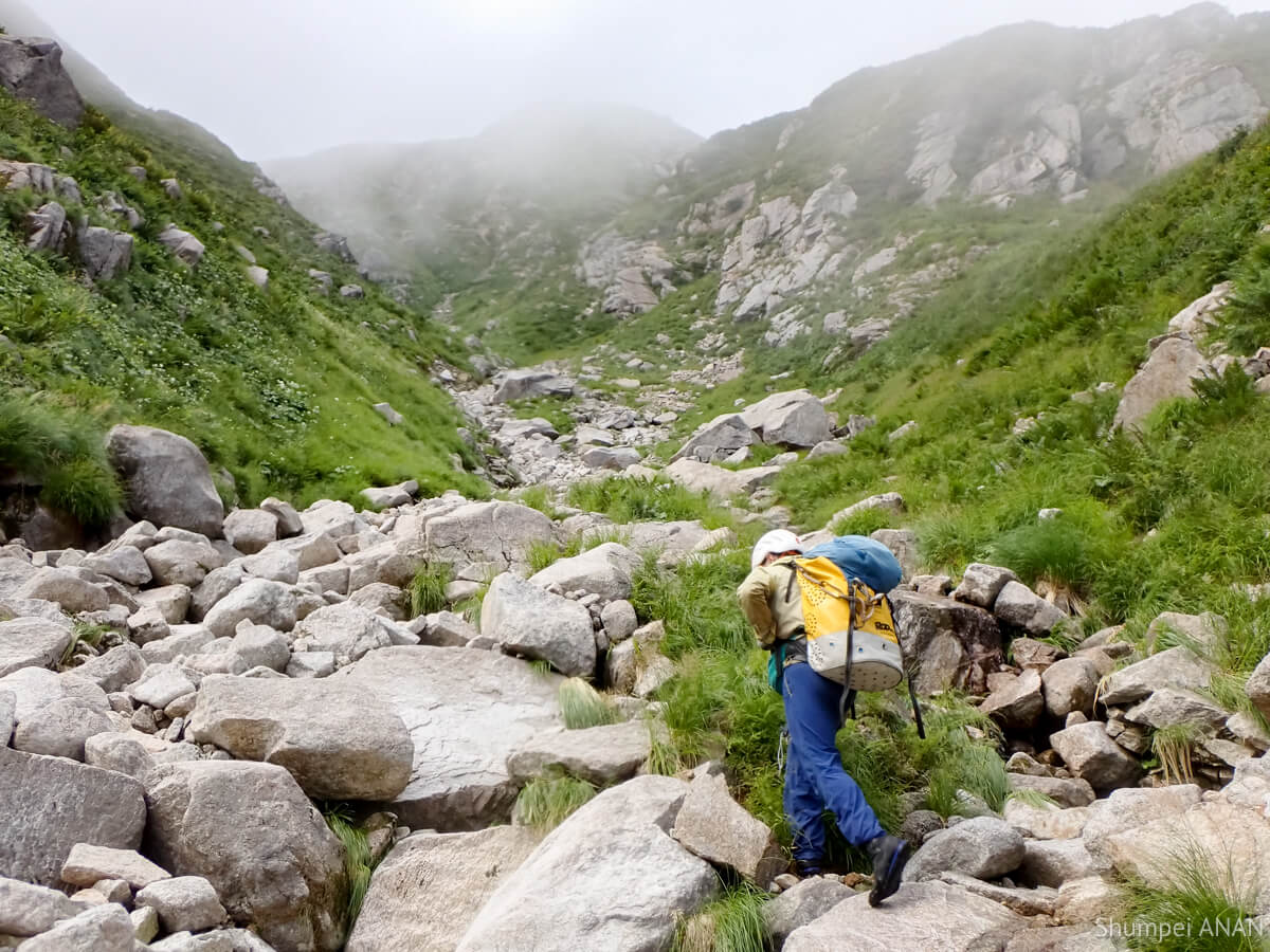 源流は右岸に岩峰群が屹立し、その上空を猛禽類が旋回している。 湧いてきたガスも相まって神秘的な空間だった。 ラストの詰めは急傾斜のニラ斜面で二人で大いに息を切らして登り切った。