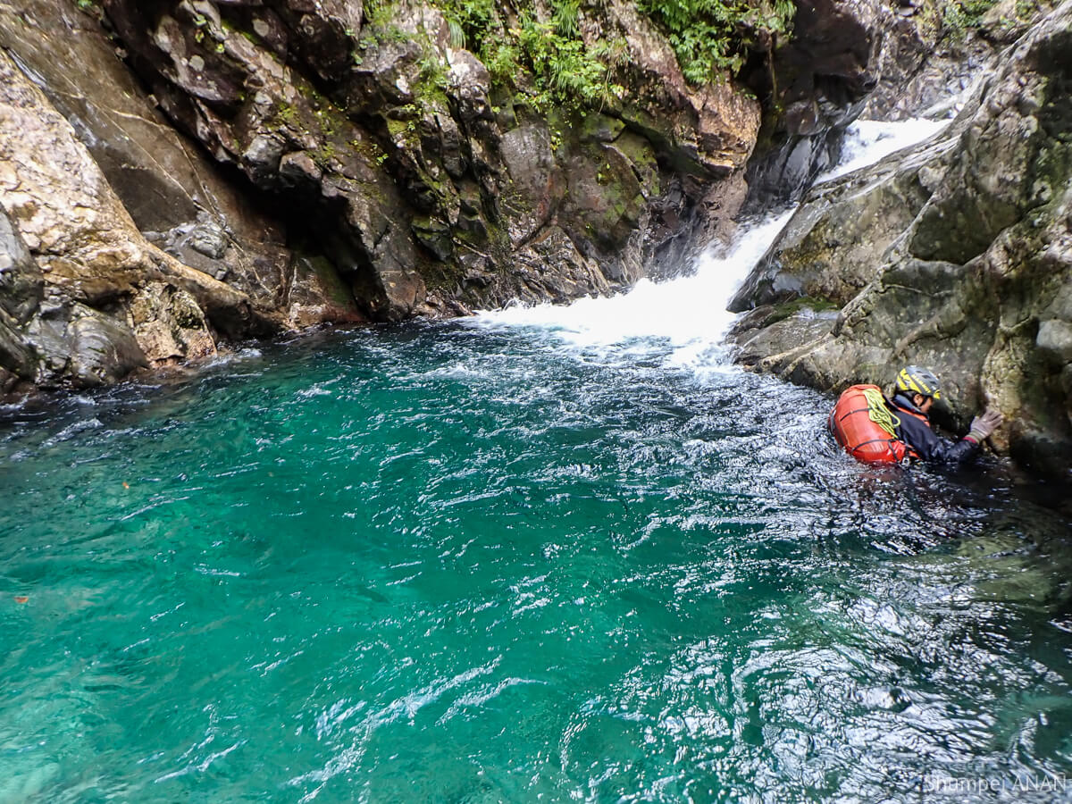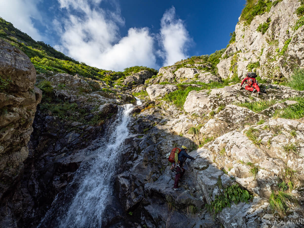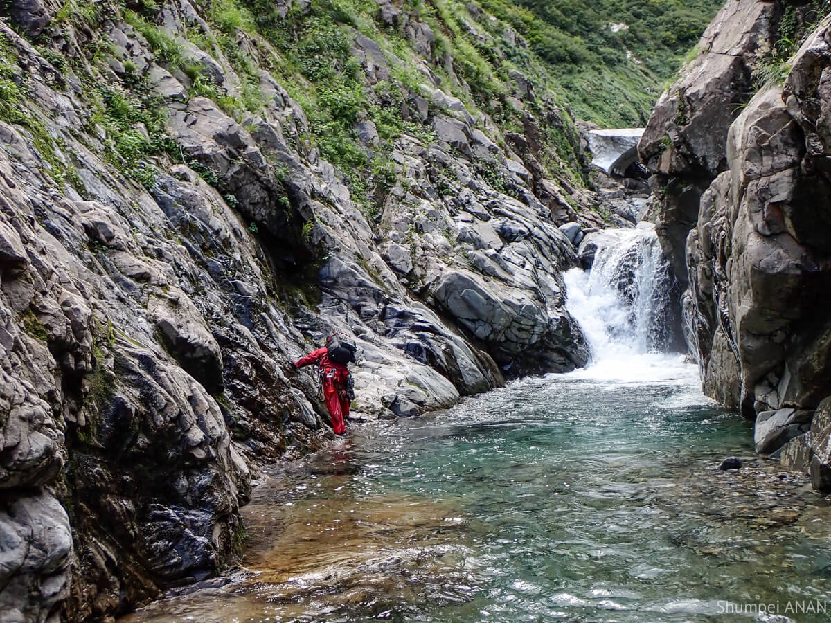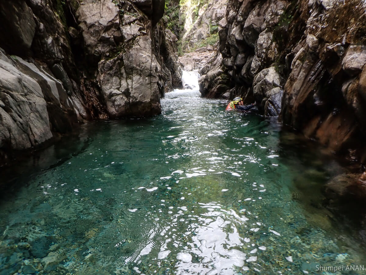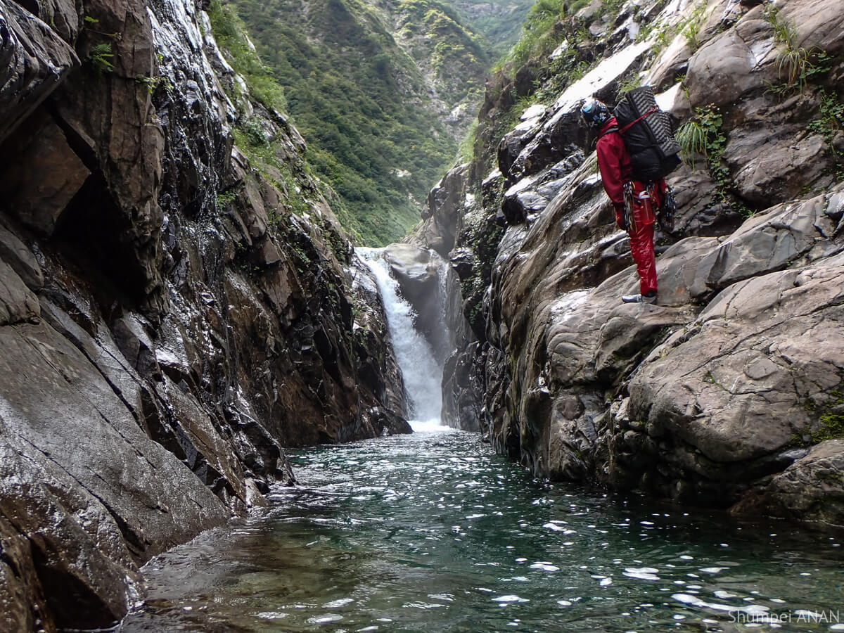 翌朝、朝からど快晴だ! 早速テン場からちょっと戻って右沢に入る。右沢は6mの滝で出合い、少し進むと早速連瀑がスタート。チムニー状の多段滝、激狭CS潜りなどアクロバティックな動きを多用して超えていく。
