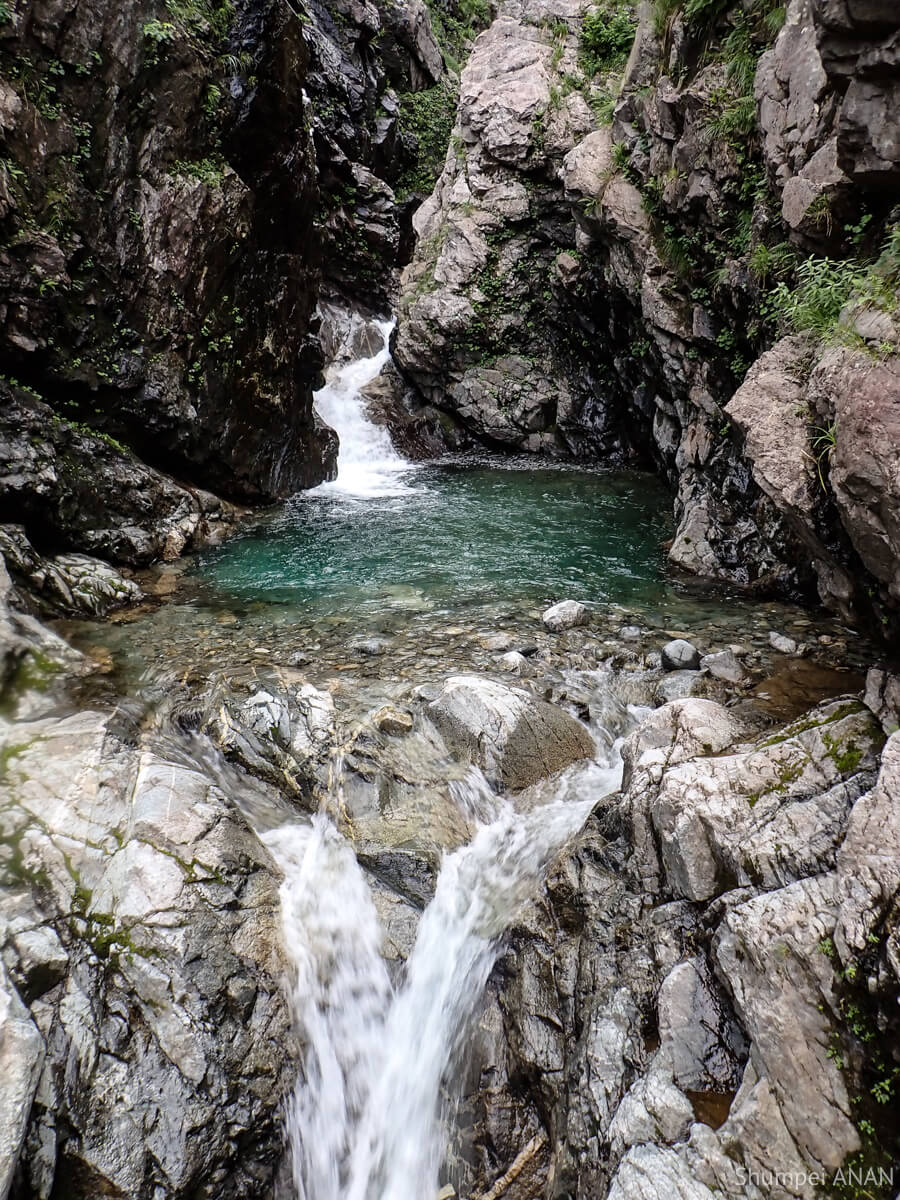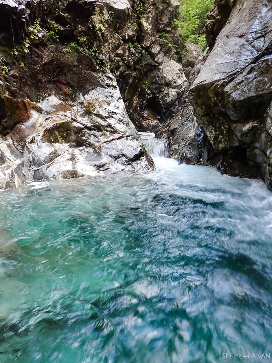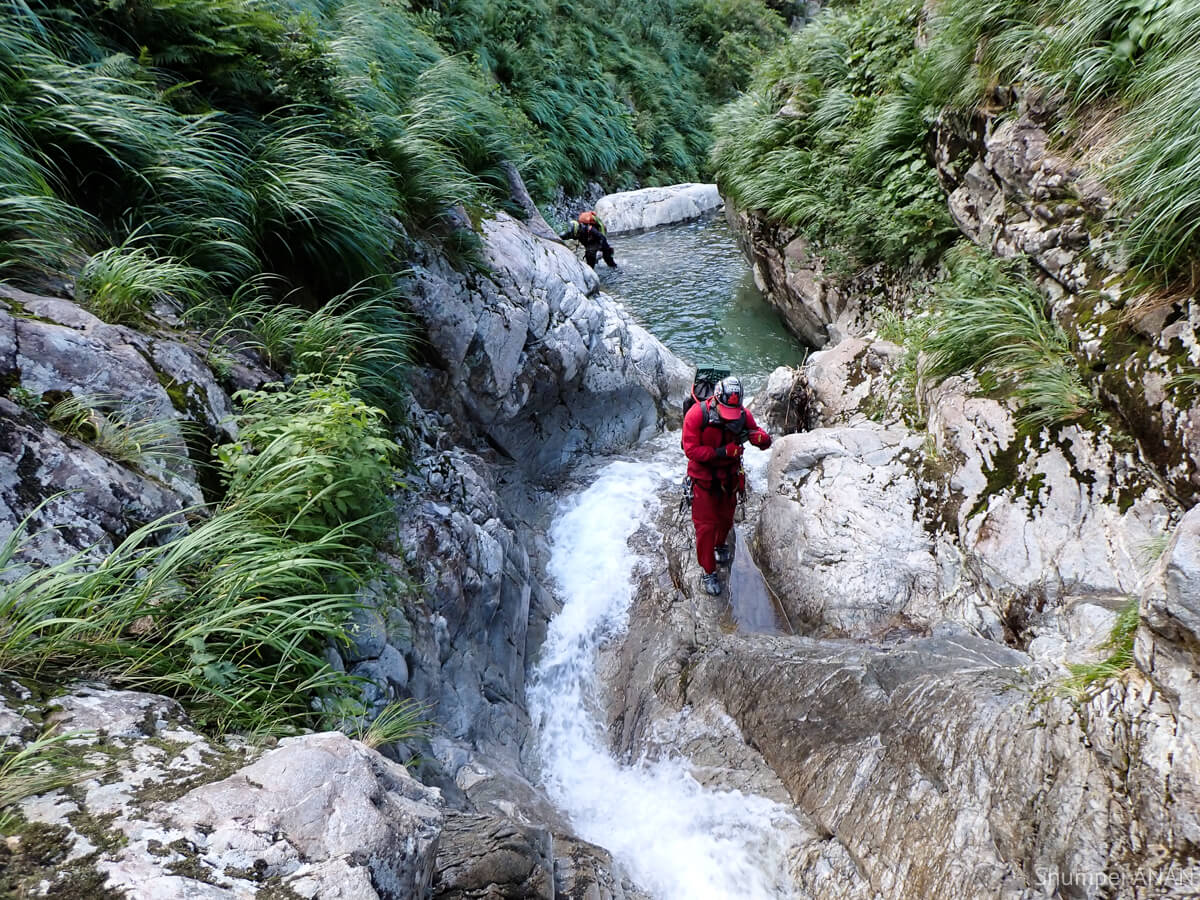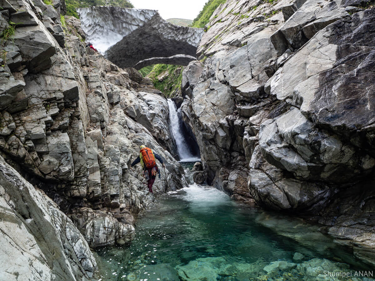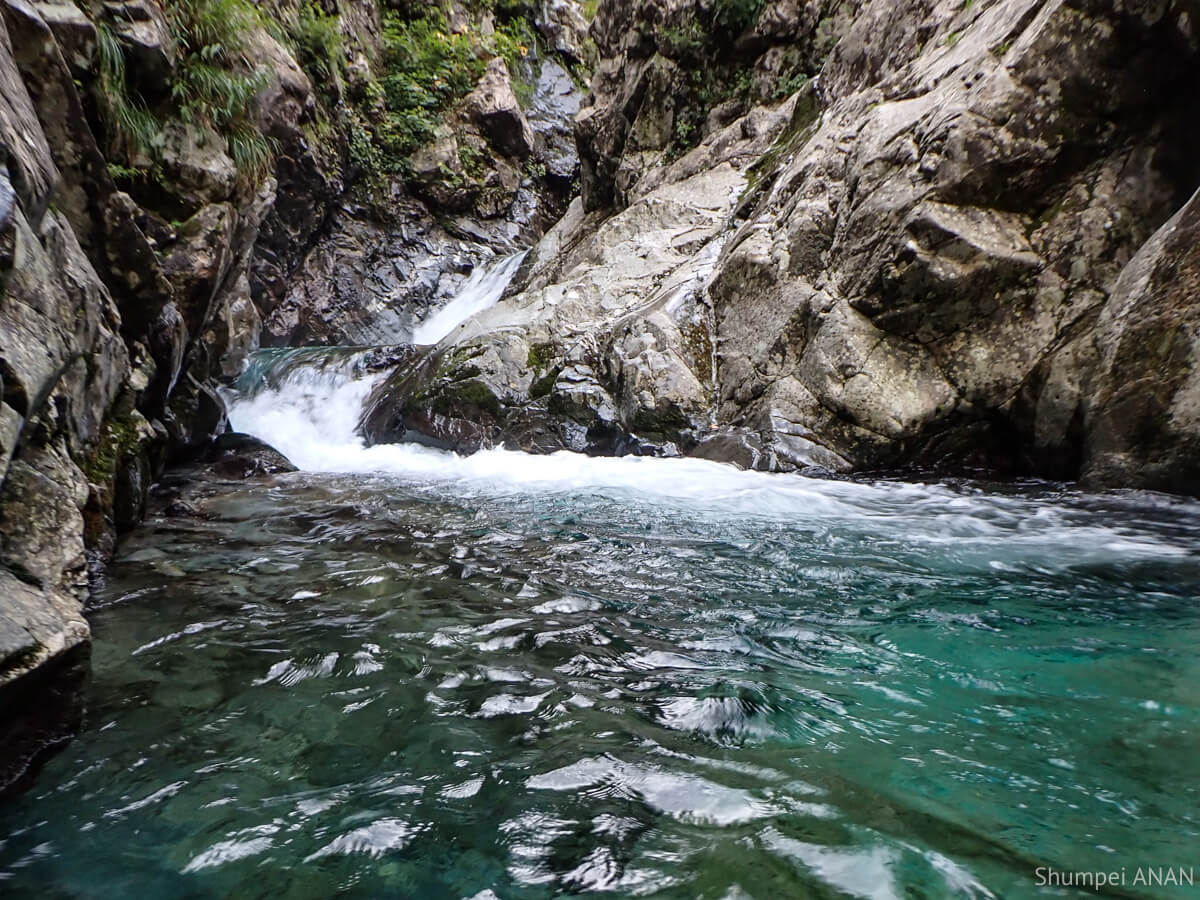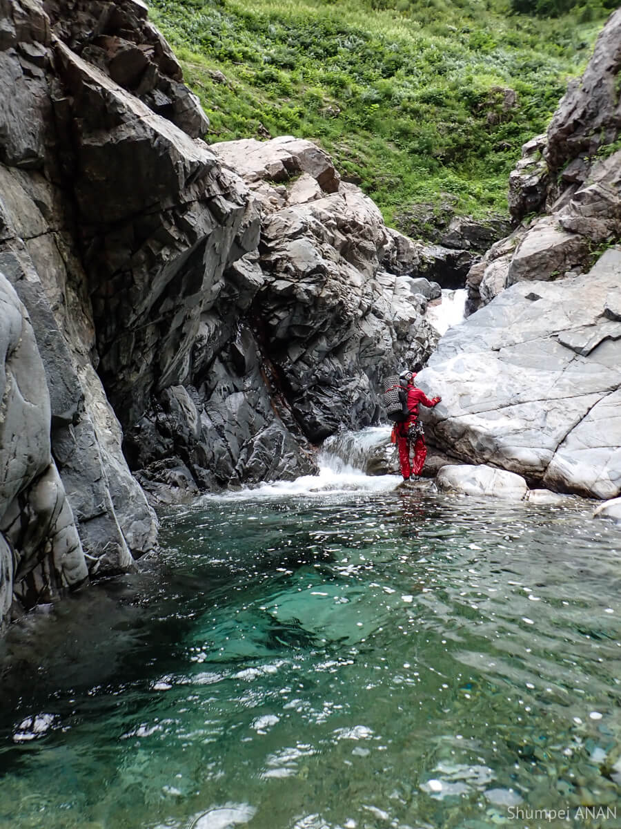 翌朝、朝からど快晴だ! 早速テン場からちょっと戻って右沢に入る。右沢は6mの滝で出合い、少し進むと早速連瀑がスタート。チムニー状の多段滝、激狭CS潜りなどアクロバティックな動きを多用して超えていく。