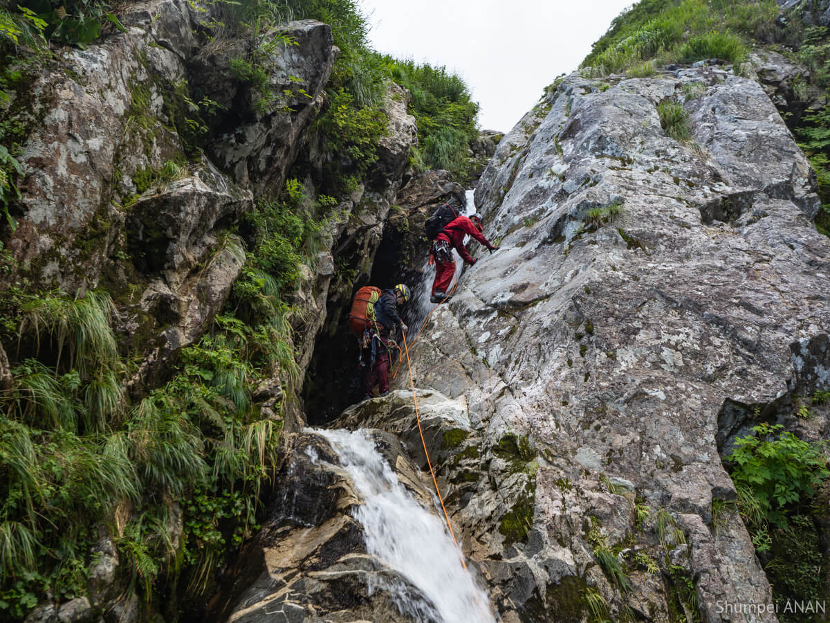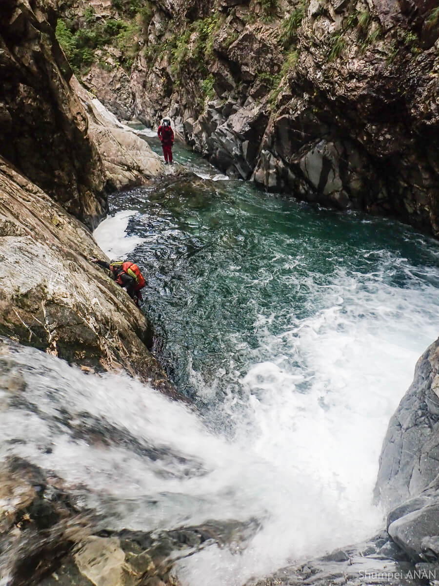 上段の15m滝が見えてきた、そして進む左俣がここで7m滝を伴って出合う。連瀑の途中で出合うとはなかなかの険谷っぷりだ。 左俣出合へは7mの懸垂下降で降り立つ。
