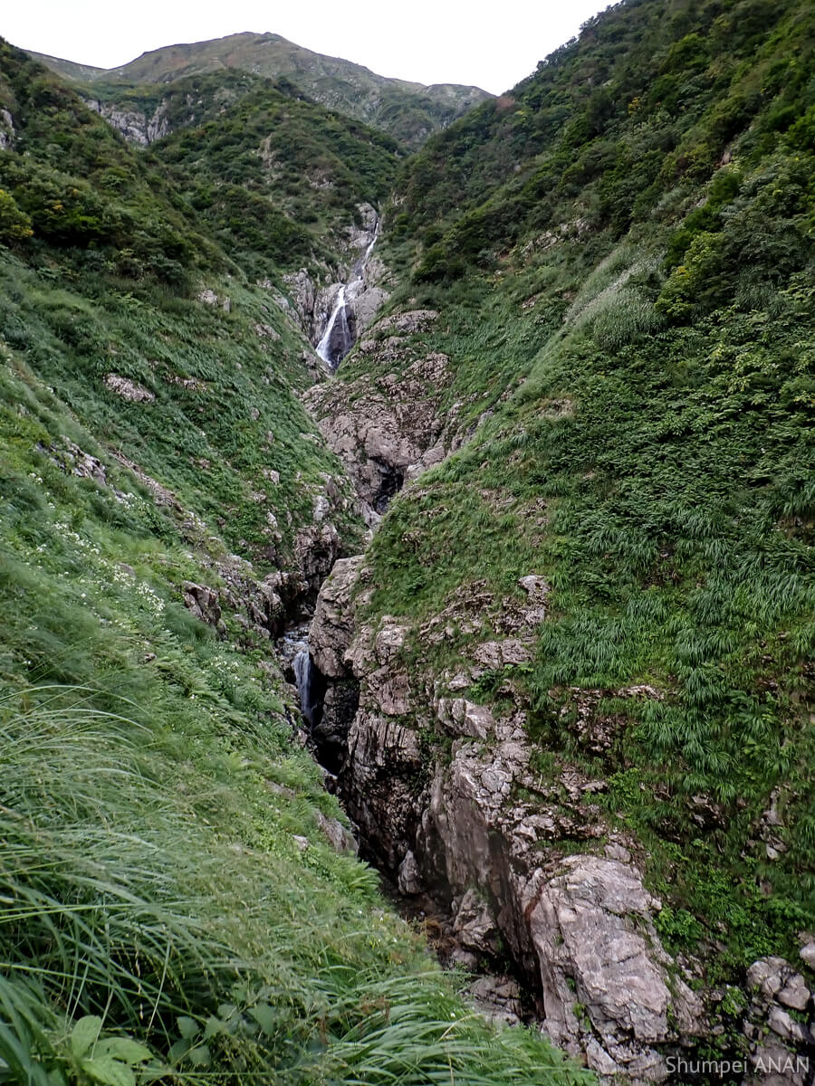 案外快適な高巻きで落口の高さまで到達。 落口上のスリットゴルジュの中は5m滝が落ちており、すぐ河原になっている。 滝上はいきなり源頭の雰囲気で、遥か先寒江山の稜線まで見通せる。
