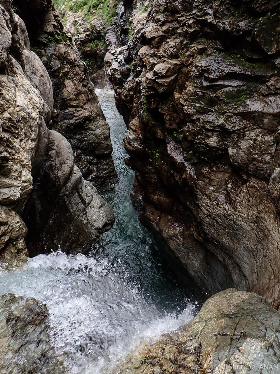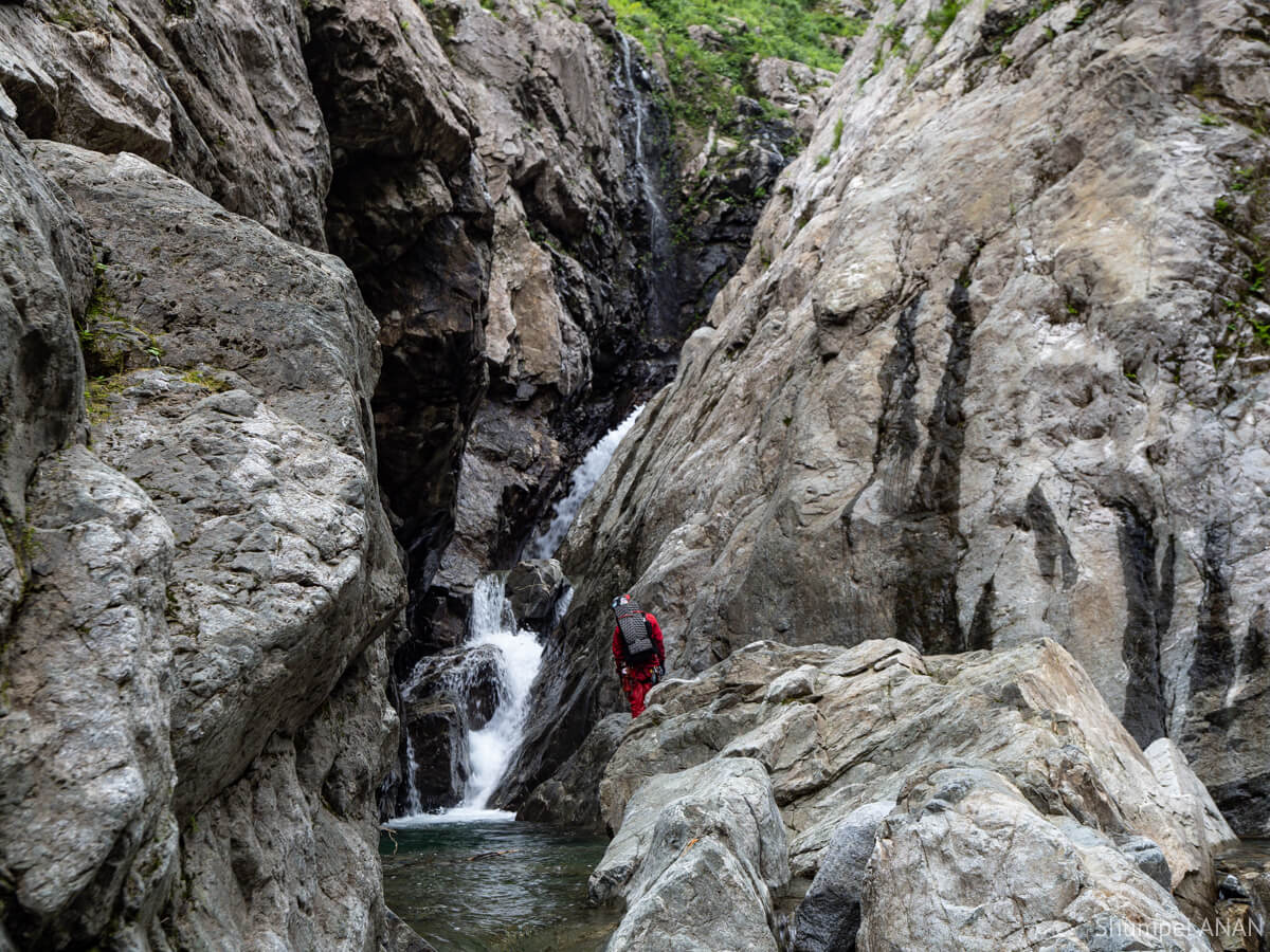 沢に降り立つと、すぐ背後はとんでもなく険しいゴルジュとなっている…! これは流石に登れないだろう。巻いてきて正解だった。