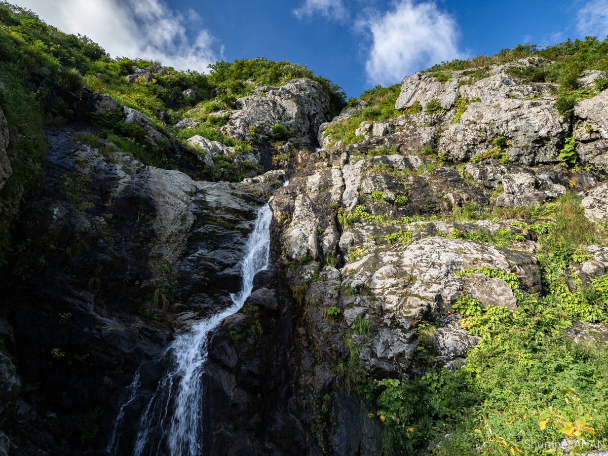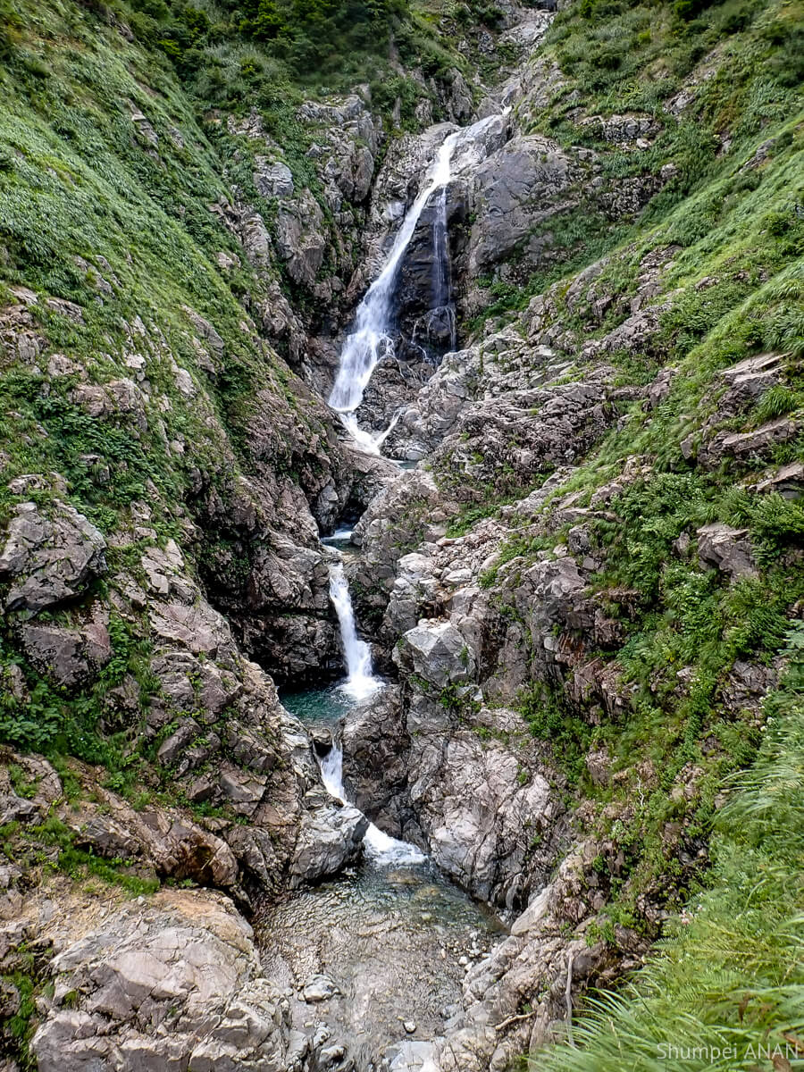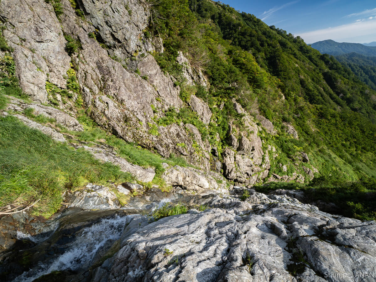 中段は傾斜の緩いナメ滝で左岸側が草地になっている。ここで景色を楽しみながら一服。