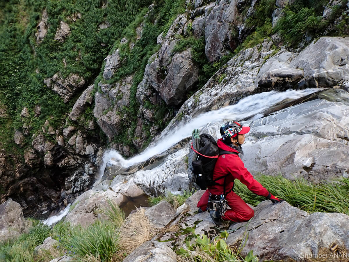 主瀑は滝右壁のゴツゴツから巻き気味に登る。わりかし、簡単に滝の上に行くことができてホッとする。