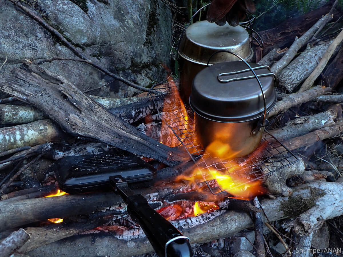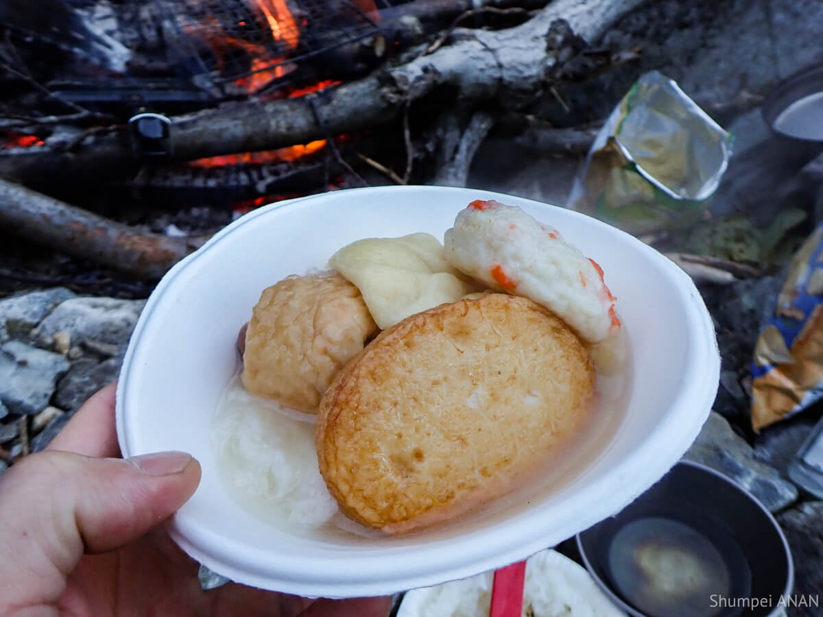 準備は整った!あとは宴会をおっぱじめるだけ! 肉におでんにポテト、信じられないくらいのご馳走が大量に振る舞われた。 今日も最高の1日だった〜 明日は記録未見のトウヌシ沢右俣左沢だ。果たしてどんな沢が待っているのだろうか、ワクワクしながら眠りについた・・