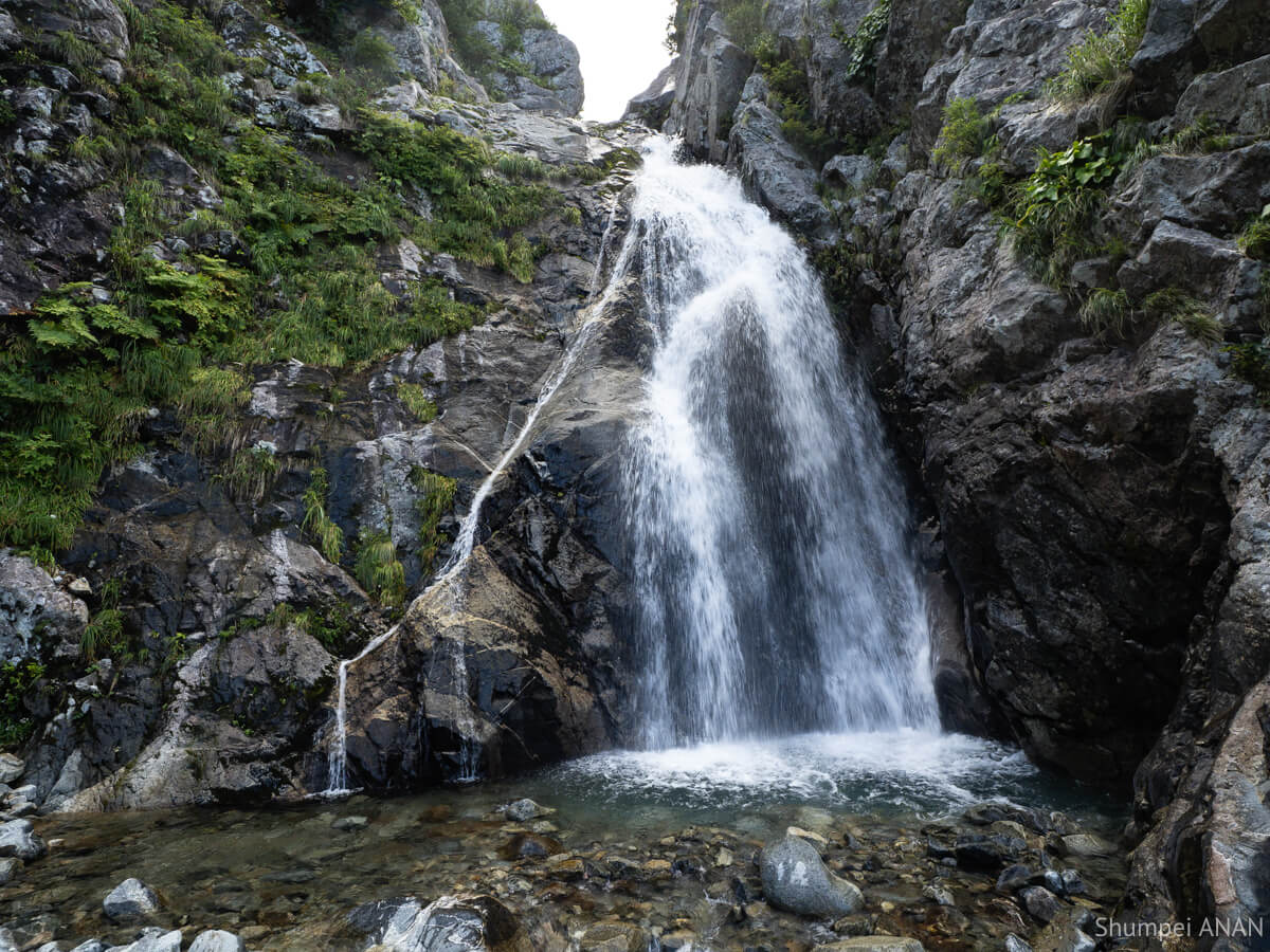 いよいよ開けてくると多段100mの右沢大滝だ。3段で向きを変えて落ちるため一度に全景は拝めないが、非常に心地よい空間。